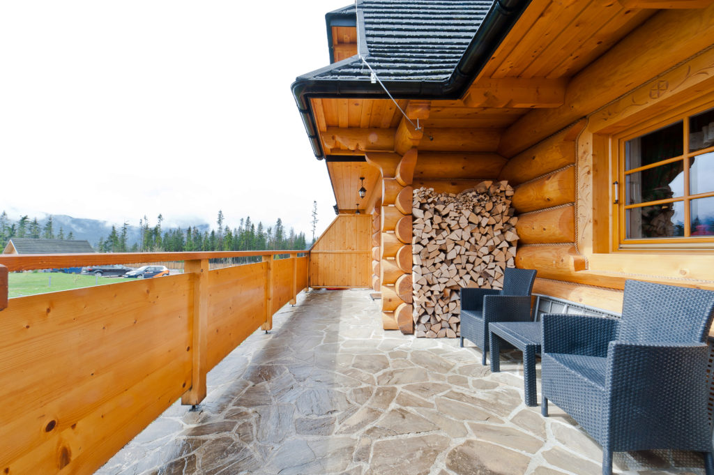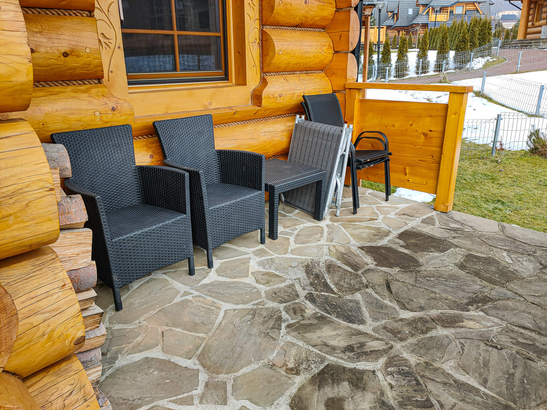 двухспальны раскладны канапа, раскладны крэсла, тэлевізар, стол, крэслы, стол і крэсла для працы, тэраса, камін.
