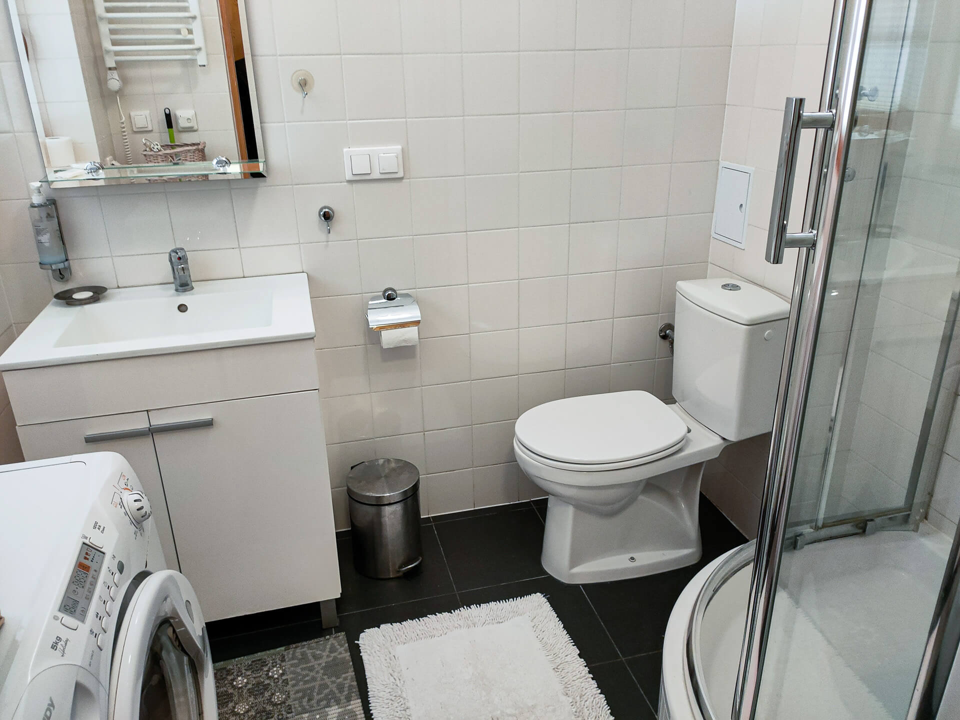 душавая кабіна, рукамыйніца, туалет, фен, пральная машына, дадатковая цёплая падлога, ручнікі.