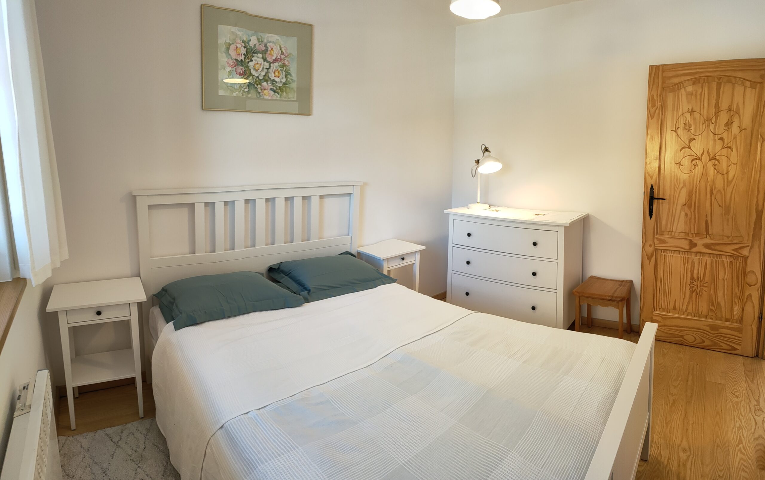 двухспальны ложак, тумбачкі, лямпы, камода.